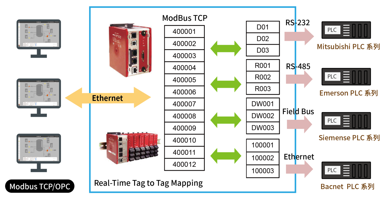 換成統一和開放式標準協定(如MODBUS TCP/IP)。如此可以截取這既有式設備的訊息,而不必再增加昂貴的升級